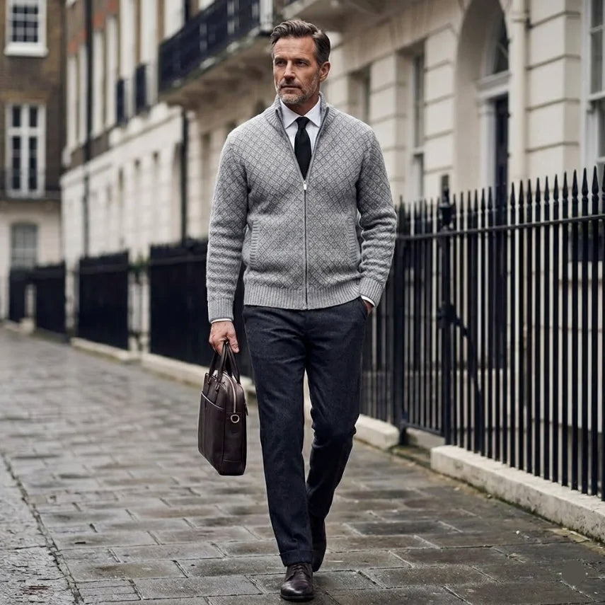 Understated authority, woven into a single garment. The Damon sweater jacket redefines casual refinement with a contemporary silhouette that transitions from morning meetings to evening gatherings without missing a beat. The premium knit construction with diamond detailing offers not just warmth, but a tangible sense of quality that elevates everything you pair it with.