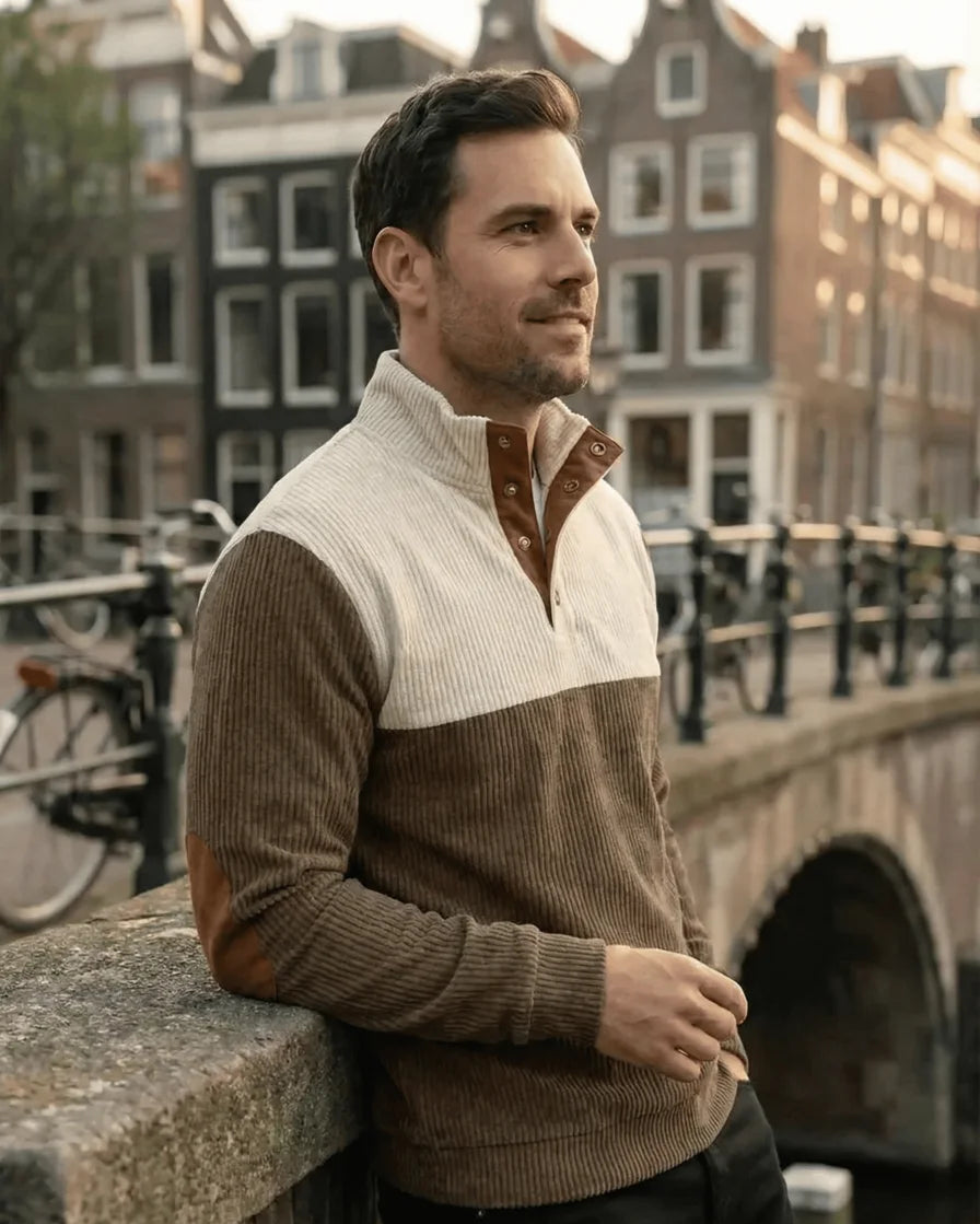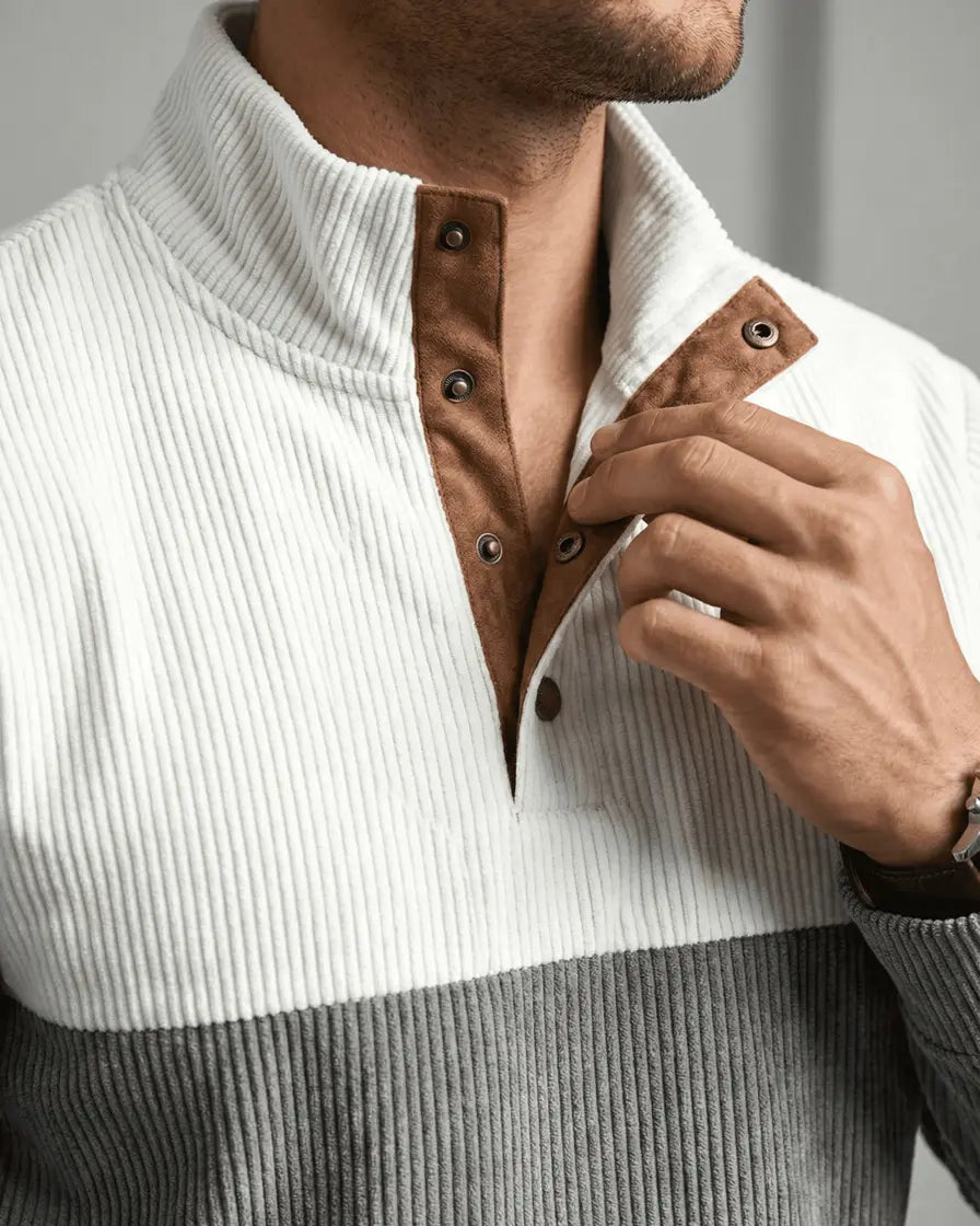 The richness of corduroy, the confidence of a high collar—this pullover exists at the intersection of comfort and sophistication. A piece that doesn't demand attention but commands it naturally. For the gentleman who knows that elegance is never loud, just unmistakably present in every detail, every texture, every moment.